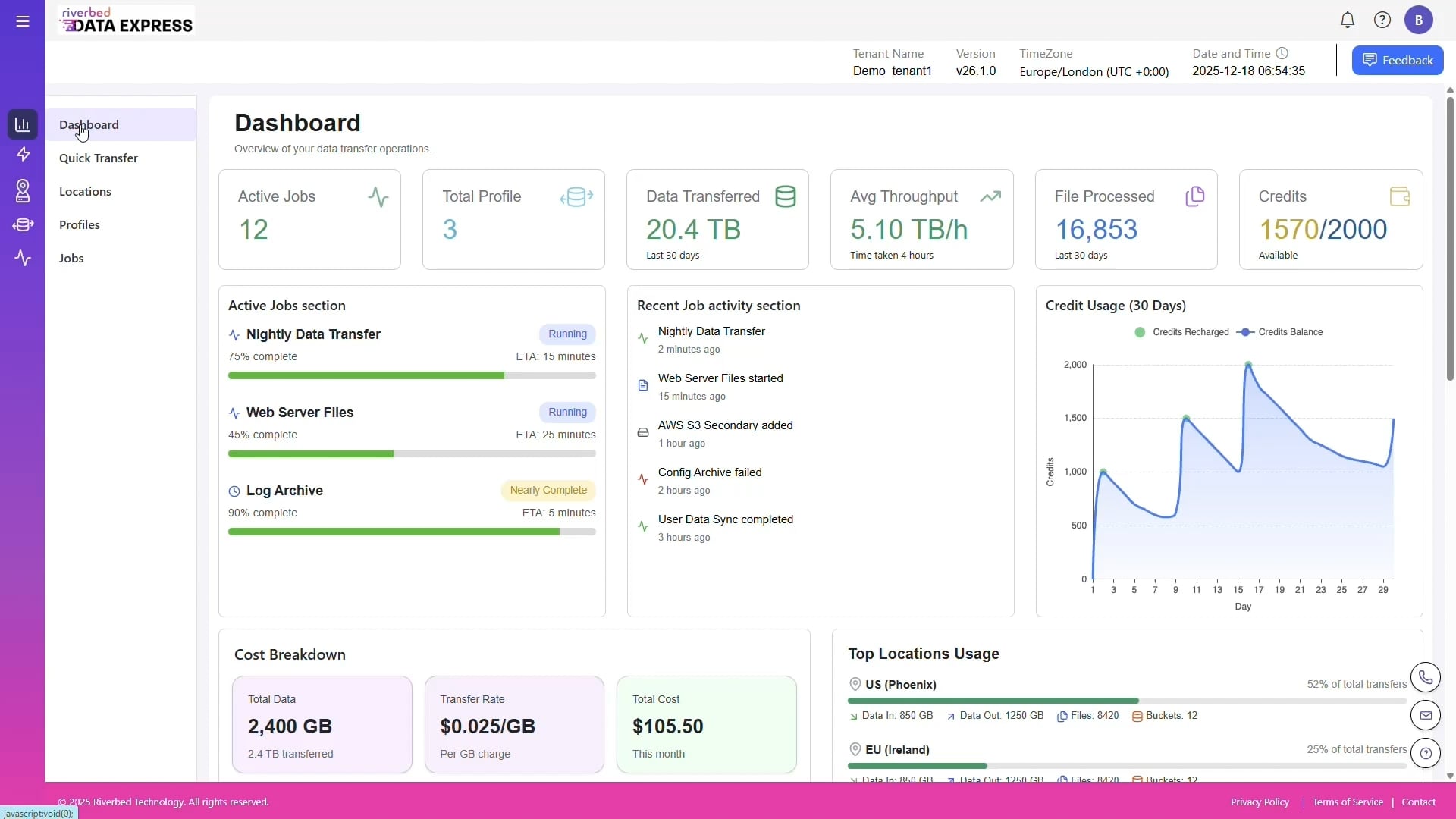 Riverbed’s Data Express Service is high-speed, secure, fully managed, cloud-delivered service that moves massive datasets—across cloud providers, zones, and data centers—up to 10x faster and at a fraction of the cost. And it comes with actionable insights to further improve performance and reduce costs.